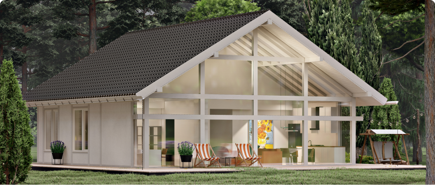 В основе витражной части фасада дома фахверковая технология – каркас, который изготавливается из клееного бруса хвойных пород древесины и является несущей конструкцией дома. Каркас выполняет роль «скелета» и позволяет избежать оседания. Фишка в том, каркас – это не просто основа дома, а еще и непосредственный элемент дизайна.