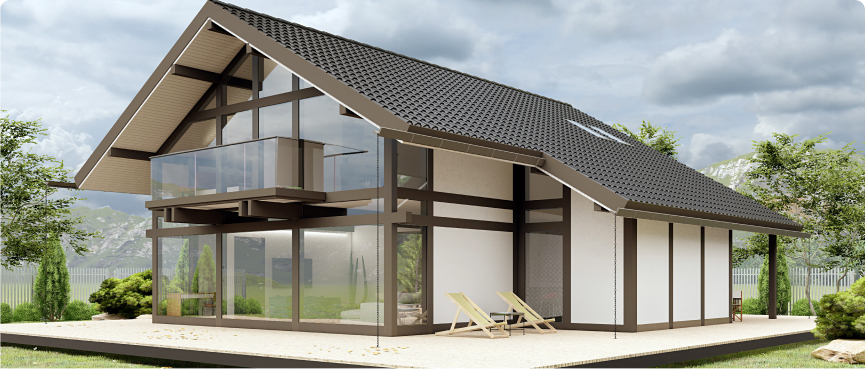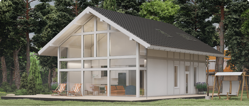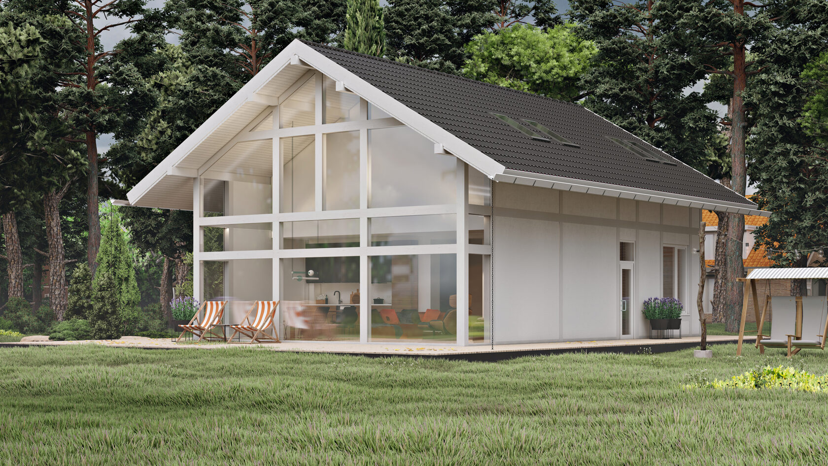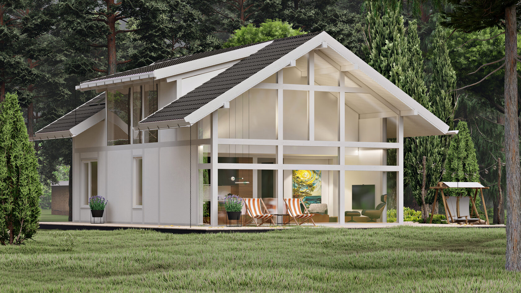Двухэтажный уютный дом увеличенной площади спроектирован для тех кто ценит комфорт и личное пространство. В доме присутствуют элементы люкс-недвижимости: панорамное остекление, второй свет - отсутствует перекрытие гостиной и кухонный зоны между первым и вторым этажом, что делает пространство просторным и наполненным светом. Это открытость, свобода и максимально возможное включение окружающей природы как жизненного пространства.