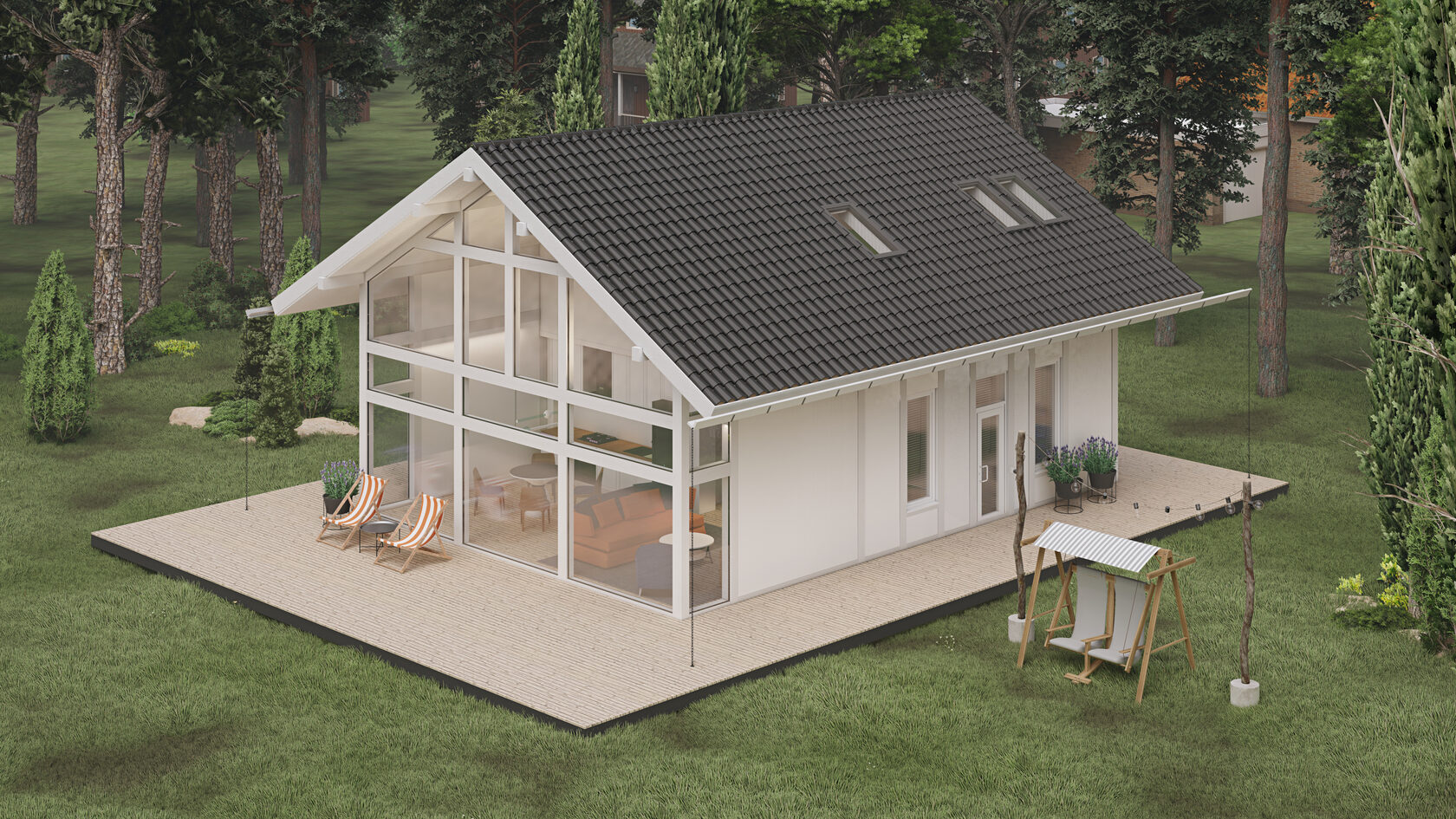 Дом имеет прямоугольную форму с внешней стороной 8.19 x 11.94 метров, а его площадь равна 150 м², так что он идеально подойдет для семьи до 4-6 человек. Высота дома в самой высокой точке составляет 6.34 метра.