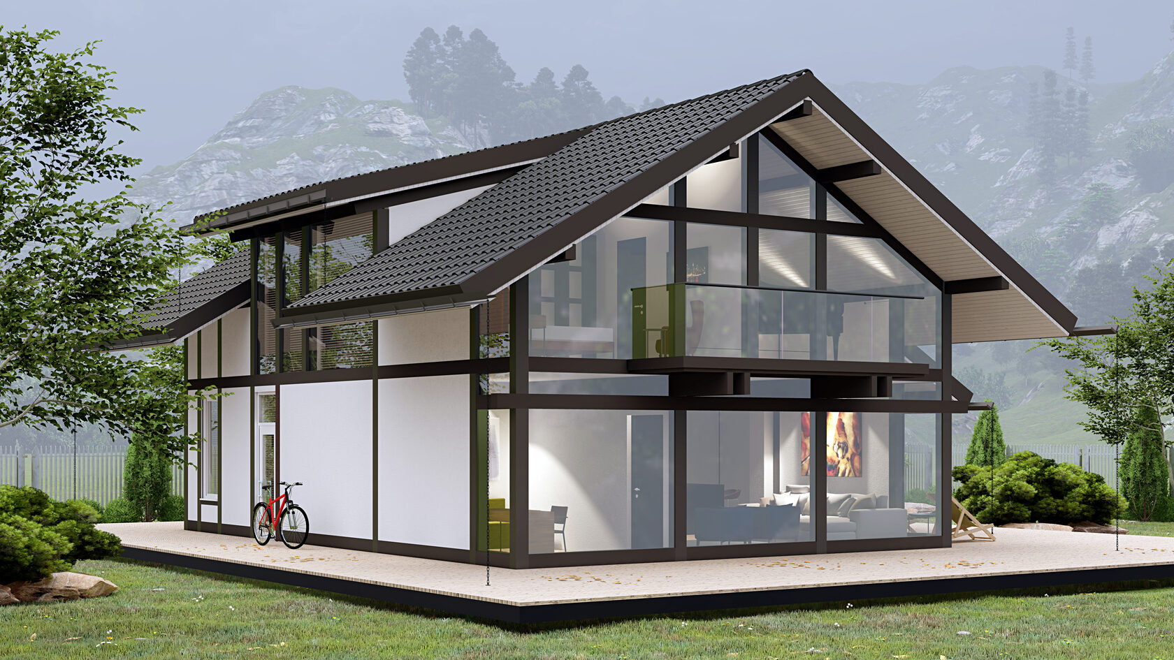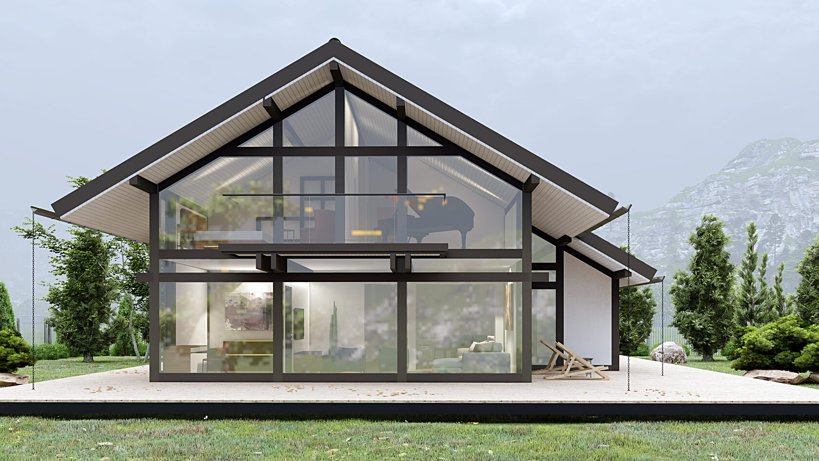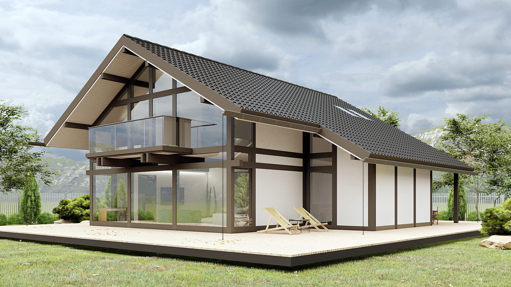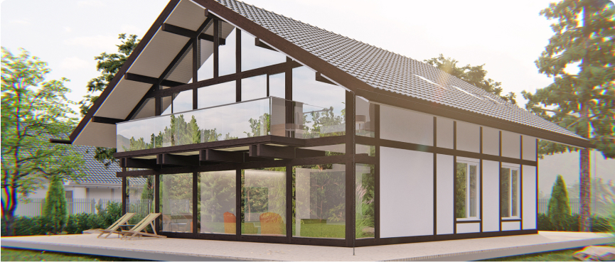 Двухэтажный уютный дом увеличенной площади спроектирован для тех кто ценит комфорт и личное пространство. В доме присутствуют элементы люкс-недвижимости: панорамное остекление, второй свет - отсутствует перекрытие гостиной и кухонный зоны между первым и вторым этажом, что делает пространство просторным и наполненным светом. Это открытость, свобода и максимально возможное включение окружающей природы как жизненного пространства.