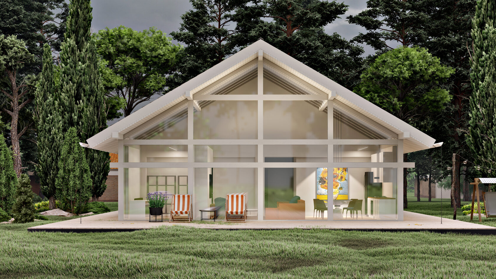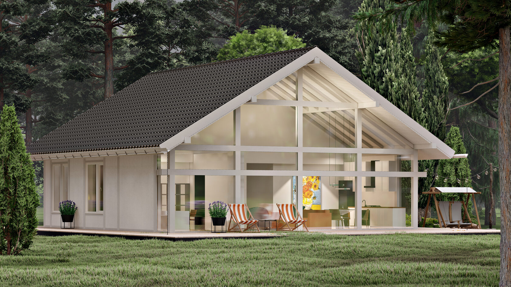 Хотя этот одноэтажное жилье, дом принципиально отличается от привычных одноэтажных домов: в нем нет чердака и плоского перекрытия над головой, поэтому высота потолков впечатляет — в самой высокой точке она составляет 6 метров.