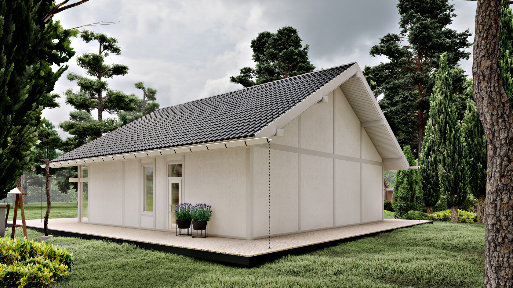 Дом имеет прямоугольную форму с внешней стороной 10.65 x 11.11 метров, а его площадь равна 100 м², так что в нем идеально разместится семья из 4 человек.